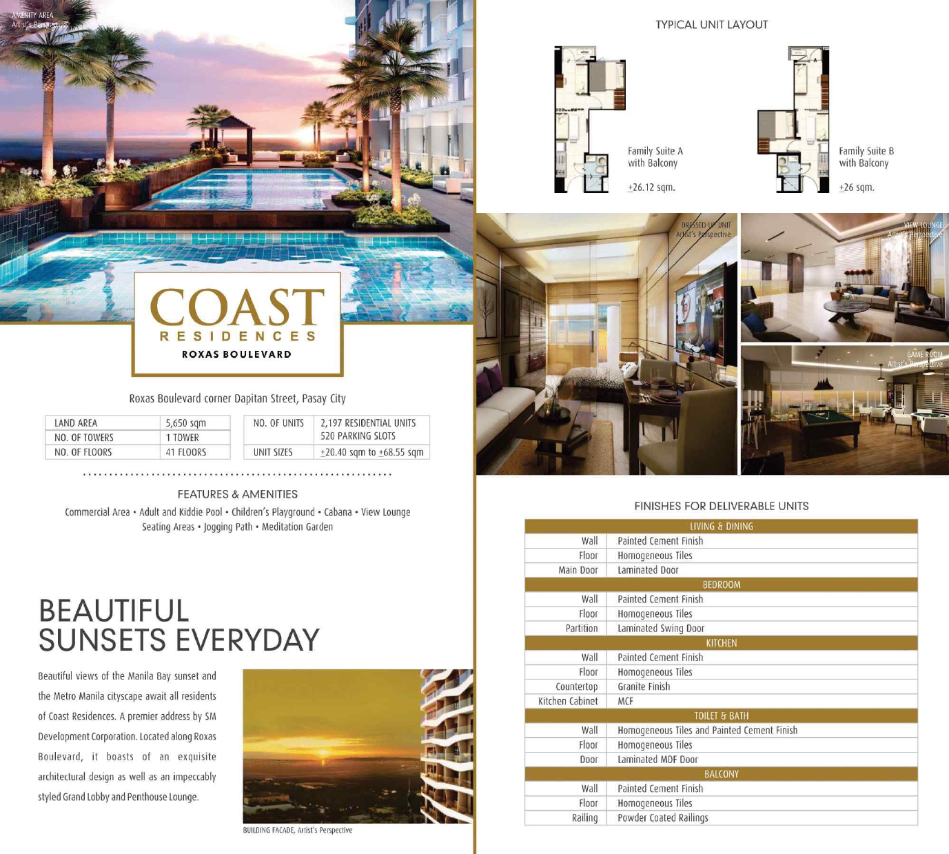 Lovers of culture and picturesque views will love living in Coast Residences! The Cultural Center of the Philippines stands a few minutes away and hosts performances including plays, ballet, musicals, opera, and more. Historical galleries, studios, and exhibits can be found in Intramuros. There is also the sunset off Manila Bay to enjoy while walking on the boardwalk.